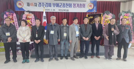 충남 부여군 경주김씨 종친회(회장 김은환)는 2026년 2월 28일 오전 11시, 내외 귀빈과 종친 200여 명이 참석한 가운데 부여새천년웨딩홀에서 제46차 정기총회를 성황리에 개최했다.   지난 한 해의 회무 성과를 결산하는 한편 김은환 회장을 임기 2년의 제11대 회장으로 선출하며 종친회의 발전 방향을 함께 모색하는 뜻깊은 시간을 가졌다.   이날 총회는 국민의례를 시작으로 장수 종친어르신들께 감사 선물을 전달하고, 공로 종친에게 공로패를 수여했으며 고등학생에게 장학금을 전달하는 순서로 진행됐다.   또한 김원식 충청남도 종친회장 표창 수여가 이루어졌으며, 김은환 부여군 종친회장의 인사말에 이어, 경주김씨 충남도종친회장 김원식과    경주김씨 상촌공파 종중 김기학 회장의 축사가 이어졌다. 이어 김민수 충청남도의회 보건복지환경위원회 위원장,    김기서 충청남도의회 건설소방위원회 의원, 김기일 부여군의회 의원의 축사가 차례로 진행되었다.   김은환 부여군 종친회장은 인사말을 통해 “종친회는 단순한 친목 단체를 넘어 전통을 계승하고 미래를 준비하는 공동체”라며, “앞으로도 장학사업의 내실화와 조직 활성화를 통해 지역 사회와 후대 종친들에게 실질적인 도움이 될 수 있도록 최선을 다하겠다”고 밝혔다.김원식 경주김씨 충남도종친회장은 축사에서 “부여군 종친회가 지역 종친 간 화합과 전통 계승에 모범적인 역할을 하고 있다”며, “앞으로도 종친회의 지속적인 발전과 공동체 결속 강화를 통해 지역과 후대에 귀감이 되는 종중으로 나아가길 바란다”고 말했다.김기학 경주김씨 상촌공파 종중 회장은 “부여군 종친회가 전통을 바탕으로 화합과 발전을 이어가고 있는 데 깊은 감사의 뜻을 전한다”며, “특히 장학사업을 통해 다음 세대에 올바른 뿌리 의식을 전하는 중요한 기반이 마련될 것”이라고 밝혔다. 이어 “전통 위에 미래를 세우는 자세로 선조의 정신을 오늘의 공동체 속에서 실천해 나가야 한다”며 “이번 총회가 종친 간 연대를 더욱 공고히 하고 새로운 도약을 향한 의미 있는 출발점이 되기를 기대한다”고 말했다.   김민수 도의원은 축사를 통해 “부여군 경주김씨 종친회가 지역 공동체의 화합과 전통 계승에 중요한 역할을 하고 있다”며 “앞으로도 지역사회와 함께 성장하는 모범적인 종중으로 발전해 나가길 기대한다”고 말했다.김기수 도의원은 “종친회의 장학사업과 공동체 활동이 지역 인재 양성과 전통 계승에 큰 의미를 지닌다”며 “지속적인 화합과 발전을 통해 지역 사회에 긍정적인 영향을 이어가길 바란다”고 밝혔다.김기일 군의원은 “부여군 종친회의 결속력과 전통을 향한 노력에 깊은 존경을 표한다”며 “앞으로도 지역사회와 상생하며 미래 세대를 위한 든든한 기반을 마련해 주길 기대한다”고 말했다.총회에서는 ▲2025년도 회의록 보고 ▲감사보고 ▲장학 결산 보고 ▲종친회 연혁 정리 ▲정기총회 결과 보고 등이 진행되었으며,    이를 통해 종친회 운영의 투명성과 지속 가능한 발전 기반이 안정적으로 유지되고 있음을 확인했다. 특히 장학사업과 회무 전반에 대한 감사 결과는 예산 집행과 사업 추진이 적정하게 이루어졌음을 보여주며, 종친회의 건전한 재정 운영과 후학 양성을 위한 노력이 지속되고 있음을 입증했다.또한 종친회는 지역 내 종친 간 유대 강화를 비롯해 장학사업을 통한 후학 양성에 힘써 온 성과를 공유하며, 미래 세대를 위한 지원 확대의 필요성에 공감대를 형성했다.부여군 경주김씨 종친회는 이번 총회를 계기로 종친 간 화합을 더욱 굳건히 하는 동시에, 전통 계승과 인재 양성을 중심으로 지속 가능한 종중 발전의 방향을 다시 한 번 다지는 계기를 마련했다.아울러 이번 총회에서는 부여군 종친회의 역사와 조직 변천 과정도 함께 정리·공유되며, 선대 종친들의 헌신 속에 이어져 온 공동체 정신을 재확인하는 뜻깊은 시간이 되었다. 한편, 총회를 마친 후에는 한국족보편찬위원회 김욱 대표가 경주김씨 상촌공파 종중 ‘창시대동보’ 편찬에 대한 설명을 진행했다.    김 대표는 창시대동보의 편찬 취지와 추진 방향을 소개하며, 종중의 역사와 정통성을 체계적으로 정립하는 작업의 중요성을 강조했다.